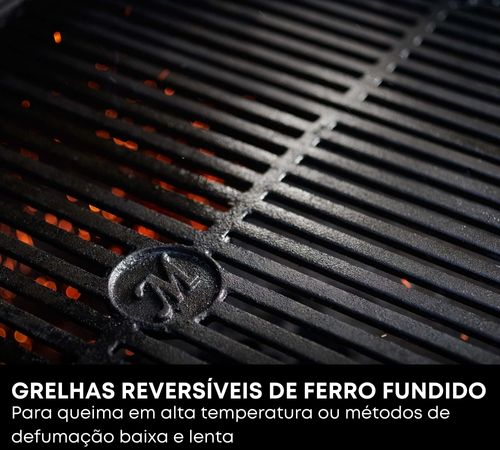 ▪ Grelhas reversíveis de ferro fundido para queima em alta temperatura ou métodos de defumação baixa e lenta;